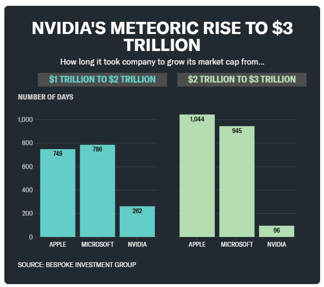 During the week, Nvidia briefly surpassed Microsoft to become the world’s most valuable company, yet by week’s end, its market cap slightly decreased to approximately $3.12 trillion, slightly below Microsoft’s $3.33 trillion.